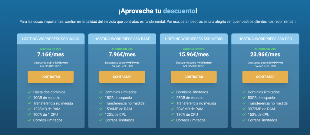 A continuación, se detallan los dos planes principales orientados a WordPress. Todos los precios indicados no incluyen impuestos.